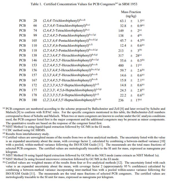 表 1、2 和 3 分別提供了 PCB 同系物、氯化農(nóng)藥和 PBDE 同系物以及多溴聯(lián)苯同系物的濃度認證值,以質(zhì)量分數(shù)表示。 NIST 認證值是 NIST 對其準確性具有最高置信度的值,因為所有已知或可疑的偏差來源都已被調(diào)查或考慮在內(nèi) [1]。經(jīng)認證的pCB 同系物、氯化農(nóng)藥和 PBDE 同系物的值基于 NIST 使用一種或多種分析技術(shù)獲得的結(jié)果與 CDC 和使用不同分析技術(shù)的實驗室間研究的額外結(jié)果的一致性。