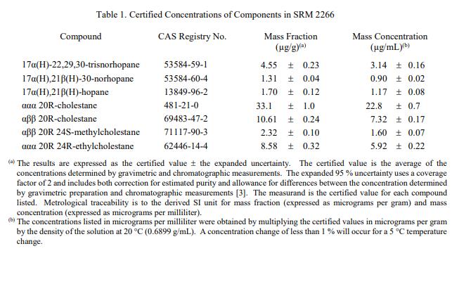 表 1 中給出了三種藿烷和四種甾烷的認(rèn)證質(zhì)量分?jǐn)?shù)值和估計(jì)不確定度以及化學(xué)文摘社 (CAS) 登記號(hào) [1]。經(jīng)認(rèn)證的濃度值基于該溶液的重量法制備結(jié)果和使用氣相色譜法確定的分析結(jié)果。 NIST 認(rèn)證值是 NIST 對(duì)其準(zhǔn)確性具有最高置信度的值,因?yàn)樗幸阎蚩梢傻钠顏碓炊家驯徽{(diào)查或考慮在內(nèi) [2]。