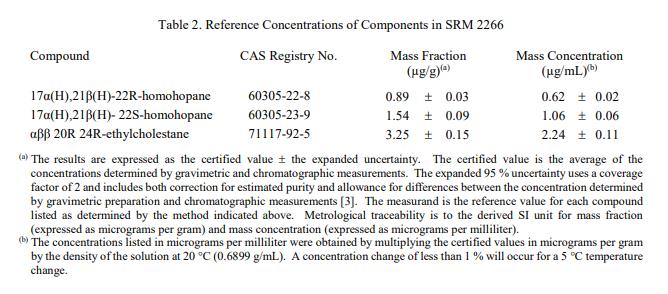 表 2 中提供了兩種額外藿烷和一種額外甾烷的參考值,也表示為質(zhì)量分?jǐn)?shù)。參考值是不符合 NIST 認(rèn)證標(biāo)準(zhǔn)的非認(rèn)證值,并提供了相關(guān)的不確定性,可能反映僅測(cè)量精度,可能不包括所有不確定性來源,或者可能反映多種方法之間缺乏足夠的統(tǒng)計(jì)一致性。