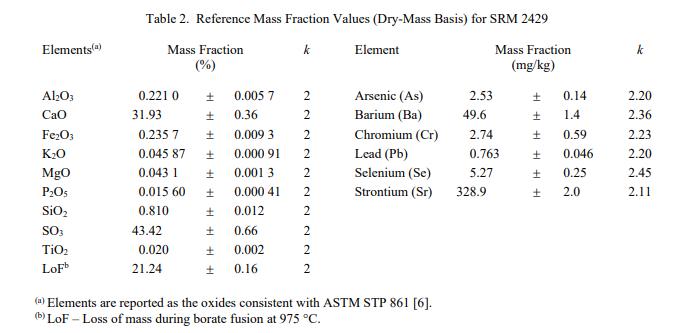 表 2 中提供了主要成分、微量元素、砷、鋇、鉻、鉛、硒和鍶的基于干質(zhì)量的參考質(zhì)量分?jǐn)?shù)值。參考值是最佳的非認(rèn)證值真實(shí)值的估計(jì);但是,這些值不符合 NIST 標(biāo)準(zhǔn)認(rèn)證并提供相關(guān)的不確定性,這些不確定性可能僅反映測(cè)量精度,可能不包括所有不確定性來(lái)源,或者可能反映多種分析方法之間缺乏足夠的統(tǒng)計(jì)一致性 [1]。被測(cè)量是表 2 中報(bào)告的元素或元素氧化物的質(zhì)量分?jǐn)?shù)