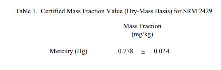 表 1 提供了汞的認(rèn)證值,表示為基于干質(zhì)量的質(zhì)量分?jǐn)?shù) [1]。NIST 認(rèn)證值是 NIST 對(duì)其在所有已知或可疑的偏差來(lái)源均已調(diào)查或考慮在內(nèi) [1]。被測(cè)量是表 1 中列出的汞量。計(jì)量溯源性是質(zhì)量分?jǐn)?shù)的 SI 派生單位(表示毫克/公斤)。