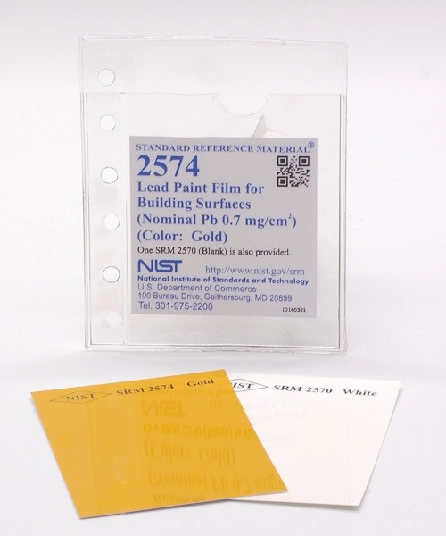 NIST SRM 2572建筑表面鉛涂料(標(biāo)準(zhǔn)品)旨在驗(yàn)證便攜式手持式 X 射線熒光分析儀的結(jié)果,用于測試建筑內(nèi)外表面油漆涂料中的鉛含量。一個(gè) SRM 2572 單元由白色聚酯片材組成,大約 7.6 厘米寬、10.2 厘米長和 0.2 毫米厚,經(jīng)過涂層處理涂有一層約 0.04 毫米厚的橙色油漆層。包括一個(gè) SRM 2570 單元,該單元涂有與鉛漆層厚度相同的無鉛漆層,用作空白。所有片材都覆蓋有透明、薄的塑料層壓板,以保護(hù)表面免受磨損。