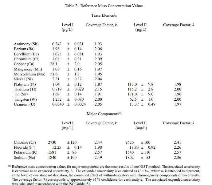 表 1 列出了 SRM 2668 的 I 級 6 種元素和 II 級 14 種元素的認證質量濃度值。 NIST 認證值是 NIST 對其準確性有最高信心的值已知或可疑的偏見來源已被調查或考慮帳戶 [1]。數值來自 NIST 和合作實驗室提供的結果的組合。