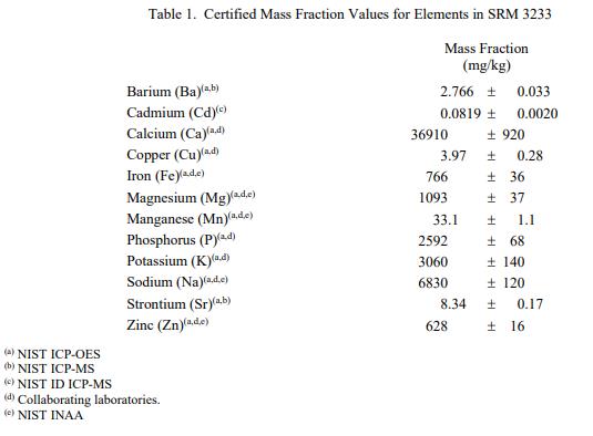 表 1 和表 2 提供了 SRM 3233 中元素和維生素的認(rèn)證質(zhì)量分?jǐn)?shù)值,以干質(zhì)量為基礎(chǔ)報(bào)告。NIST 認(rèn)證值是 NIST 對(duì)其準(zhǔn)確性有最高置信度的值因?yàn)樗幸阎蚩梢傻钠妬碓炊家驯徽{(diào)查或考慮 [1]。價(jià)值分配分析由 NIST 和合作實(shí)驗(yàn)室進(jìn)行。認(rèn)證值計(jì)算為 NIST 方法的平均值、美國農(nóng)業(yè)部 (USDA) 方法的平均值以及合作實(shí)驗(yàn)室提供的平均結(jié)果的中位數(shù)(如果適用)。所有值在沒有加權(quán)的情況下合并。相關(guān)的不確定性以 95% 的置信水平表示 [2-4]。