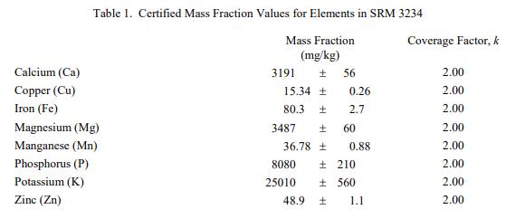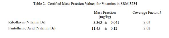 表 1 和表 2 提供了 SRM 3234 中元素和維生素的認證質(zhì)量分數(shù)值,以干質(zhì)量為基礎報告。NIST 認證值是 NIST 對其準確性有最高置信度的值因為所有已知或可疑的偏見來源都已被調(diào)查或考慮 [1]。價值分配分析由 NIST 和合作實驗室進行。認證值計算為 NIST 方法的平均值和合作實驗室提供的平均結(jié)果的中位數(shù)(在適當?shù)那闆r下)。所有值在沒有加權的情況下合并。相關的不確定性以大約 95% 的置信水平表示 [2-4]。