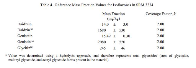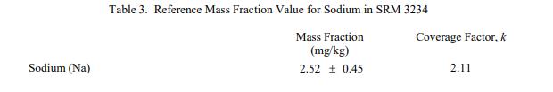 表 3 到表 6 提供了 SRM 3234 中鈉、異黃酮、近似物、總膳食纖維、卡路里和氨基酸的參考質(zhì)量分數(shù)值,以干質(zhì)量為基礎報告。NIST 參考值是未經(jīng)認證的值,它是基于可用數(shù)據(jù)對真實值的最佳估計;但是,該值不符合 NIST 認證標準 [1],并且提供的不確定度可能僅反映測量再現(xiàn)性,可能不包括所有不確定性來源,或者可能反映多種分析方法之間缺乏足夠的統(tǒng)計一致性。參考質(zhì)量分數(shù)值來自 NIST 或合作實驗室報告的結(jié)果。