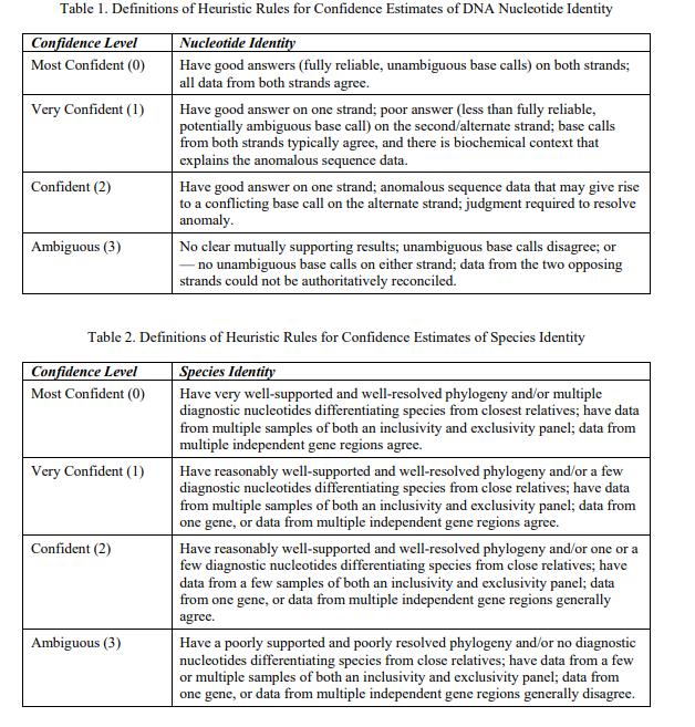 經(jīng)認證的物種鑒定是銀杏,來自 psbA-trnH 基因間間隔區(qū)和 trnL 內(nèi)含子區(qū)域的相關(guān)葉綠體 DNA 序列可在伴隨的 FASTA 格式文件中獲得 [1]。與序列中每個核苷酸相關(guān)的不確定性,以及與作為物種標識符的 DNA 序列相關(guān)的不確定性,以表示對規(guī)定值的信念強度的序數(shù)尺度表示(0 = 最有信心,1 = 非常有信心,2 = 有信心,3 = 模棱兩可)(表 1 和表 2)[2]。