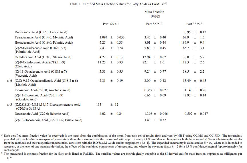 脂肪酸測(cè)定的分析方法:SRM 3275 中脂肪酸濃度的賦值是基于在 NIST 使用兩種獨(dú)立分析方法進(jìn)行的測(cè)量的組合:氣相色譜與火焰離子化檢測(cè) (GC-FID) 和 GC 與質(zhì)量如下所述的光譜檢測(cè) (GC/MS)。